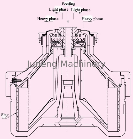 Unfiltered материалы (смешанная жидкость) переданы к частям сердца этой машины (внутренности барабанчика). Под действиями сильной маховой силы, материалы пройдут через интервалы группы в составе пачки части диска. И после этого, нейтральное отверстие части диска быть интерфейсом, жидкость с более высокой плотностью (тяжелым участком) двинет наружу нейтральное отверстие вдоль части диска, через кольцевые каналы круга барабанчика наружного, пропуская к тяжелому выходу участка. Тяжелые выпарки будут аккумулированы в зоне седимента, ждать разрядку когда машина будет выключена. Жидкость с более низкой плотностью (светлым участком) двинет вверх вдоль стены части диска и соберет в малом центростремительном насосе, outputted малым центростремительным насосом.