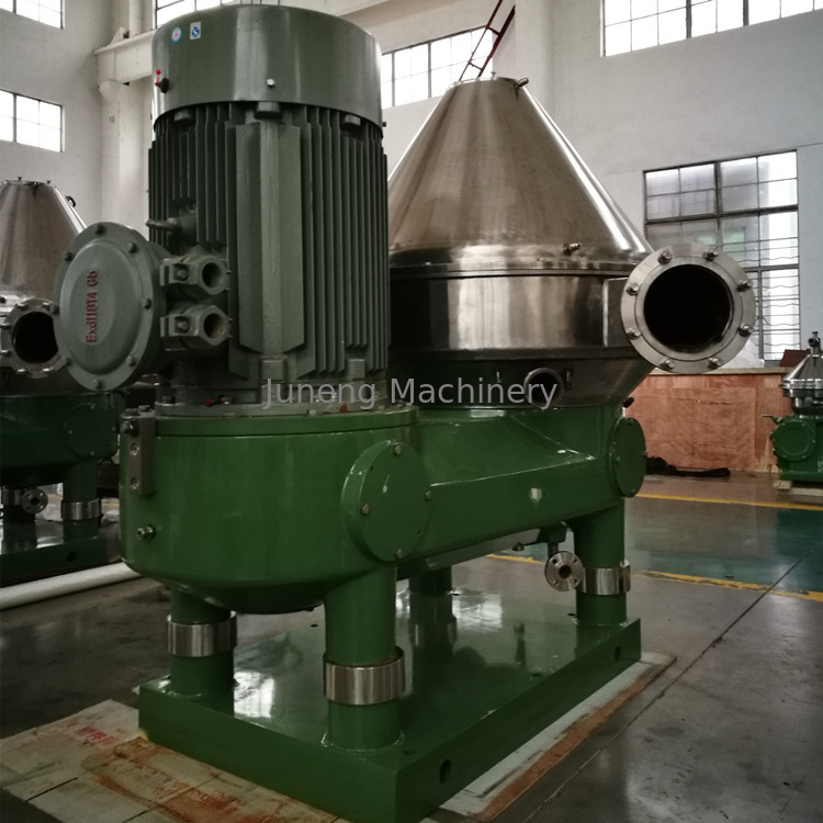 Отделенный материал будет поступать в сердце сепаратора, т.е. в барабан.Под действием сильного поля центробежной силы материал проходит разделительную перегородку, состоящую из колонны дисков. Жидкость с большим удельным весом движется по стенке диска к внешней стороне нейтрального отверстия, где в зоне осадка скапливается тяжелый шлак, а тяжелый фаза поступает к восходящему центростремительному насосу;Жидкость с малым удельным весом движется по стенке диска к нейтральному отверстию и сужается к нижнему центростремительному насосу.Легкая и тяжелая фазы выводятся нижним центростремительным насосом и верхним центростремительным насосом соответственно;Тяжелый шлак регулярно выгружается;С непрерывным производством.